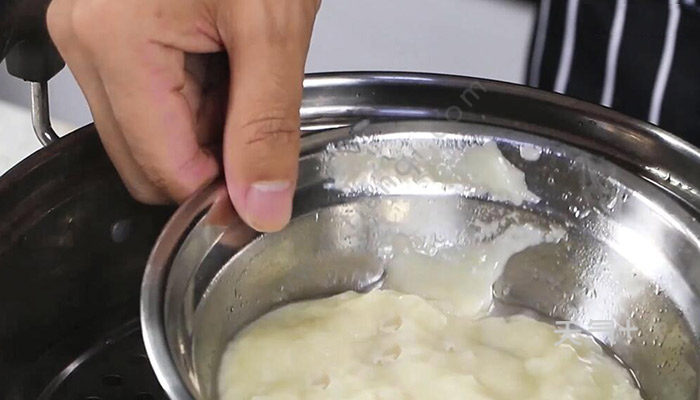 3、盆子里抹一层油,将糊糊倒进盆子,然后放进蒸锅里,大火蒸20分钟,蒸好后取出;