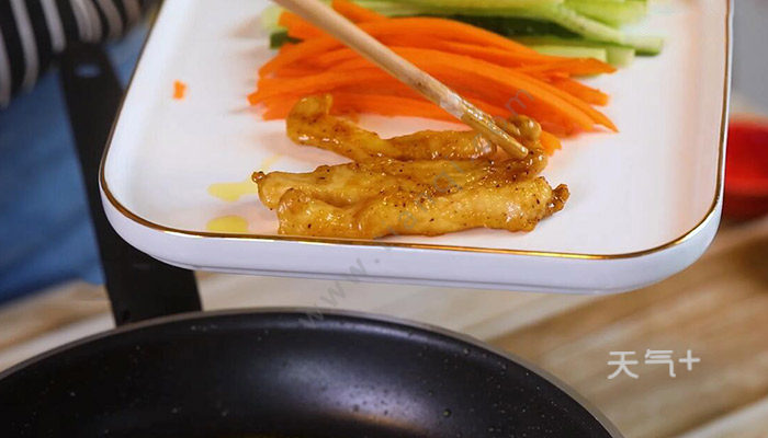 面饼1张、鸡胸肉100克、生菜1片、黄瓜1根、胡萝卜1根、姜2片、盐2克、淀粉10克、黑胡椒粉2克、料酒3克、生抽5克、番茄酱1汤匙。