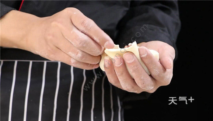 5、馅料放入面皮,朝一个方向捏褶子,直至将面皮边缘捏完,收口,再压成饼;