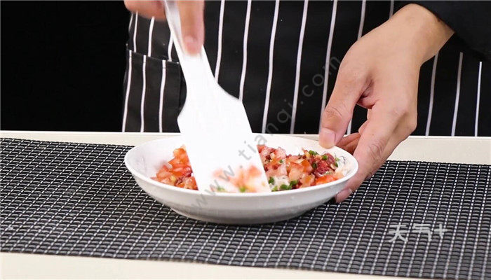 2、将牛肉末、猪油、西红柿丁、姜蓉倒入碗中,加生抽、料酒、盐、胡椒粉、葱花拌匀冷藏30分钟;