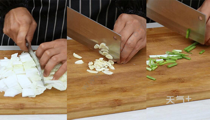 白菜切块,葱切段,蒜切片。锅里倒适量油,油热后下入干辣椒、蒜、白糖、葱花,大火爆香。再倒入白菜,翻炒至断生。然后倒入醋、生抽,翻炒均匀即可。