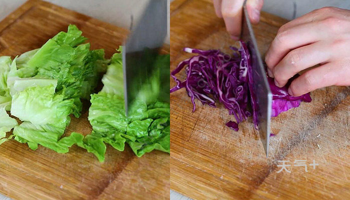 1、首先将生菜洗净,切成小段,紫甘蓝洗净切丝;