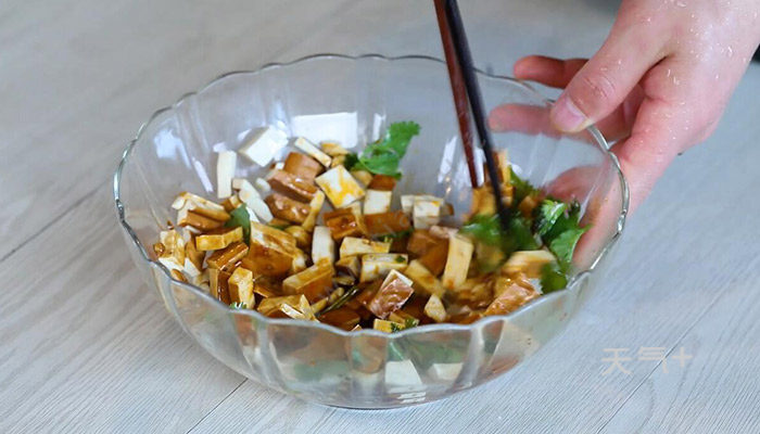 豆干洗净切丁。香菜切成段,大蒜切末。碗中放入豆干丁、香菜、蒜末,调入生抽10克、盐1勺、鸡精1勺、白糖1勺、辣椒油5克、花椒油3克、香油3克搅拌均匀,装盘即可食用。
