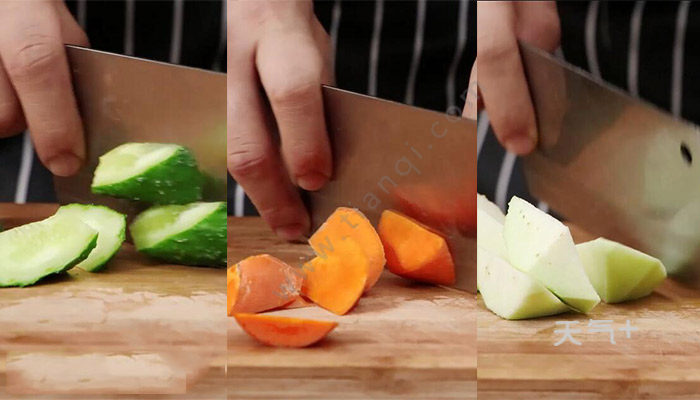 2、黄瓜、胡萝ト、茄子切成滚刀块;