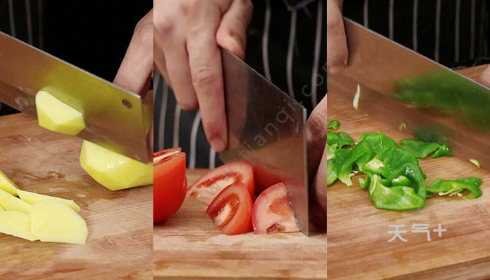 1、土豆切滚刀块,西红柿切小块,青椒切片备用;