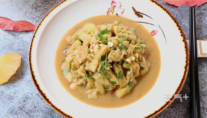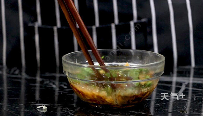 4、茄子的家常做法 麻酱茄子的做法茄子放入碗中,再淋上酱汁,拌匀,装盘即可。