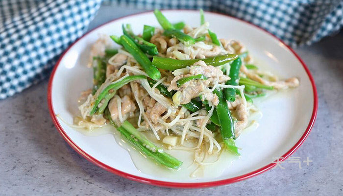 里脊切丝,肉片里加入料酒、生抽、再加入淀粉、鸡蛋清搅拌均匀,腌制10分钟,青椒切丝,金针菇去除根部,姜切末,蒜切末。锅中加入适量油,油温烧至7成热,放入肉丝炒至变色,捞出。锅中留底油,放入姜蒜末炒香,放入青椒、金针菇炒软,再放入肉丝炒匀。最后调入盐、鸡精翻炒均匀,即可出锅。