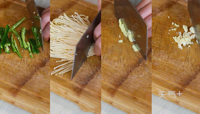 3、青椒切丝,金针菇去除根部,姜切末,蒜切末;