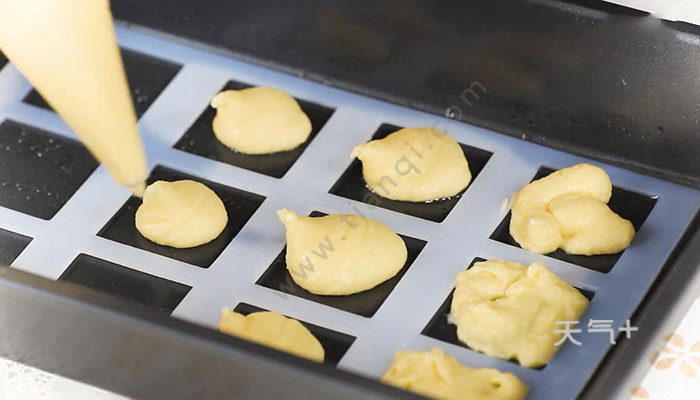 3、模具刷油,将面糊装入裱花袋中,挤在正方形模具里;