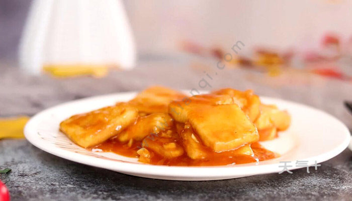 碗里倒入清水、白糖、白醋、生抽、盐、番茄酱、土豆淀粉,搅拌成料汁。密封袋内加入土豆淀粉,放入豆腐,裹上淀粉。油锅烧热,然后放入豆腐,炸至呈金黄色,捞出。留少许底油,加入蒜末炒香,再倒入料汁炒至起泡。最后加入豆腐,翻炒均匀即可。