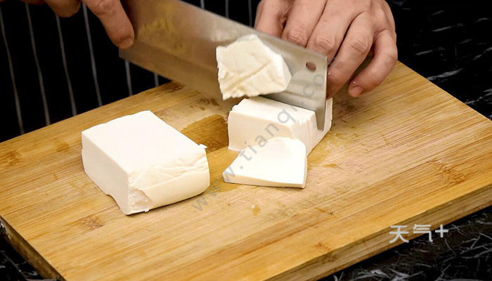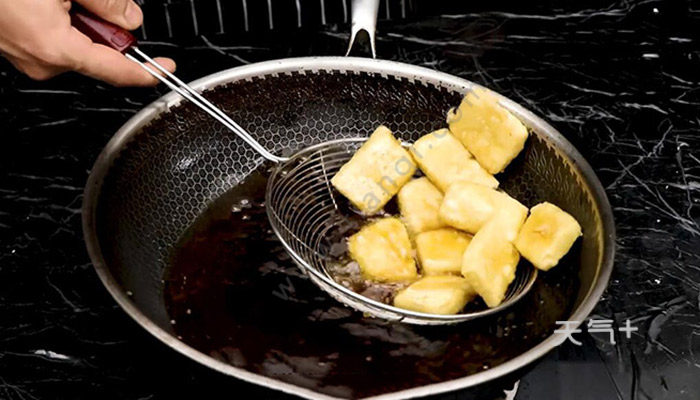 4、油锅烧热,然后放入豆腐,炸至呈金黄色,捞出;