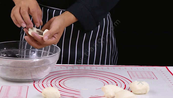 3、醒发好的面团分成数个小剂子,然后擀成中间厚周边薄,放入糖馅;