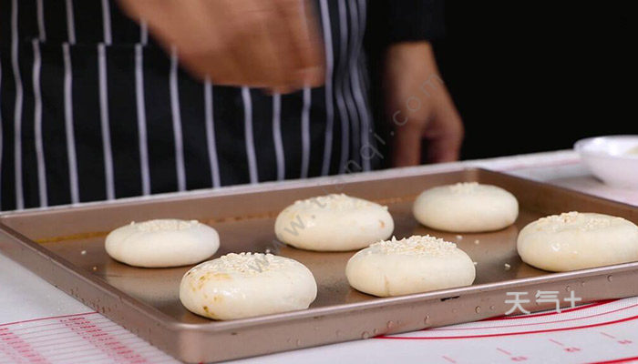 4、像包包子那样捏紧,擀成圆形饼状,喷水撒芝麻;