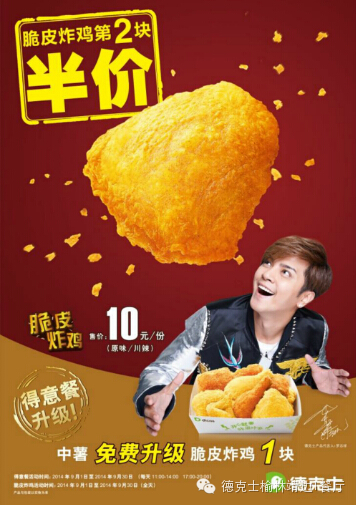 即日起,德克士当之无愧的大牌-脆皮炸鸡,现正价购买第二块享半价,得意餐里的中薯还免费升级脆皮炸鸡哦!左手半价,右手升级,咔滋享不尽~,脆皮炸鸡活动时间2014年9月1日-2014年9月30日