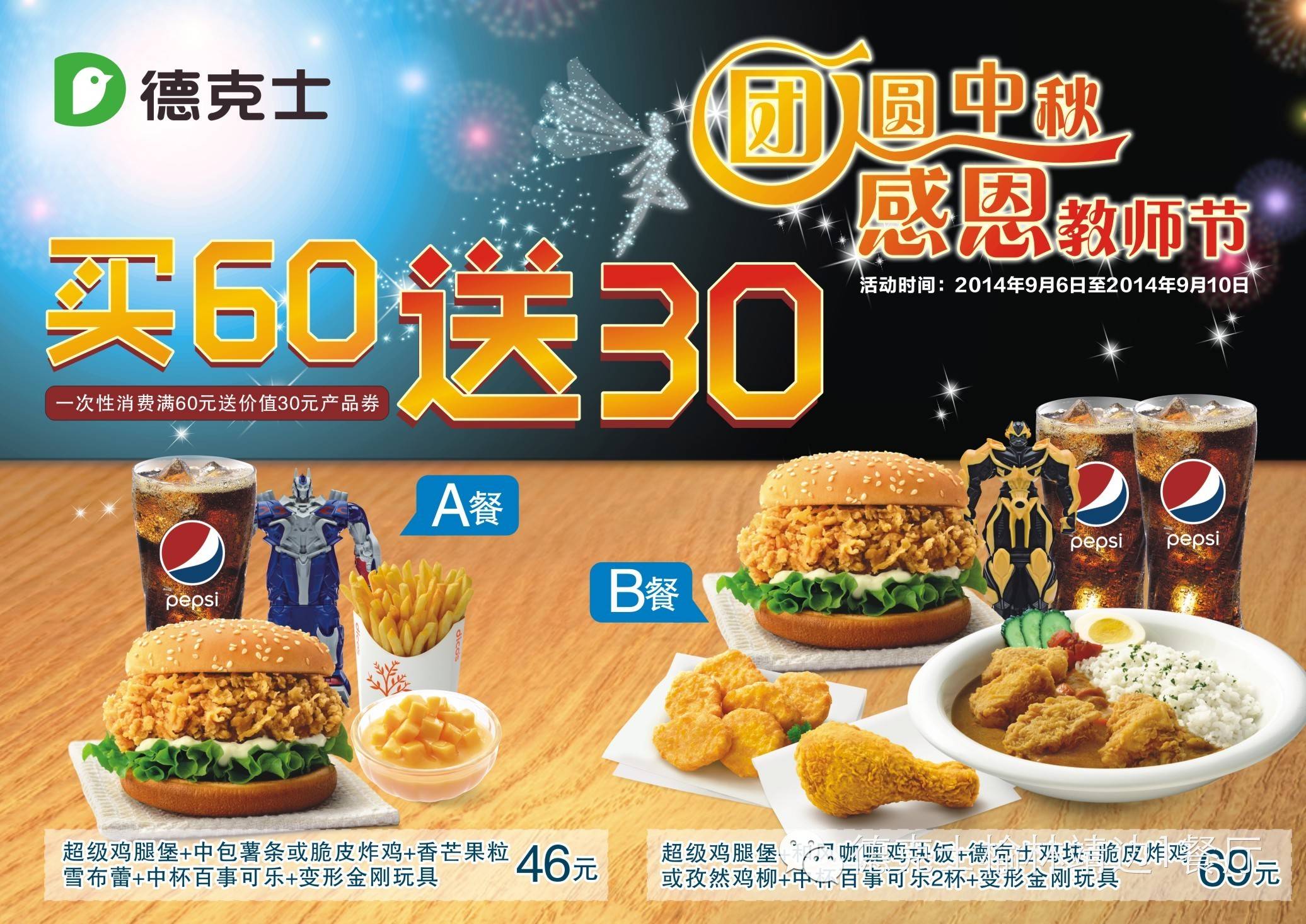 中秋之际,德克士为回馈新老顾客,凡进店消费满60元的顾客就送30元的产品免费兑换劵,机不可失失不再来,还在等什么呢?快来德克士享受舒食一刻!活动时间:2014年9月6日-2014年9月10日