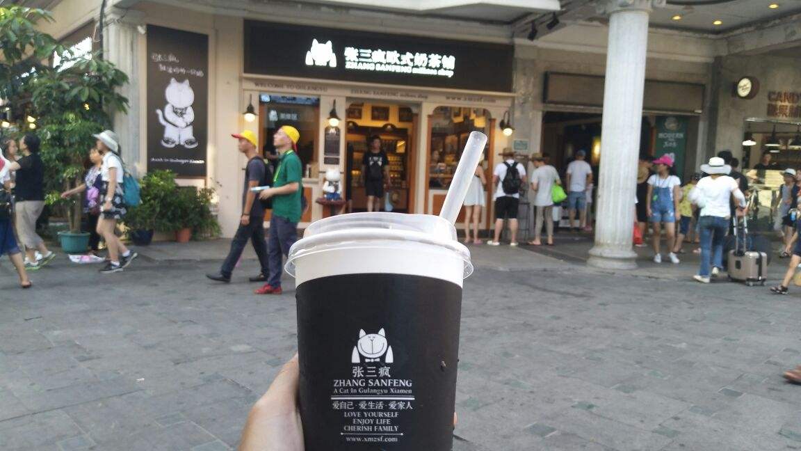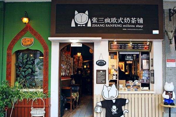 张三疯本来是一只猫的名字,它在出生后不久就被遗弃,后来被爱猫的人士收养。于是,张三疯就在旅游区的鼓浪屿开始了自己肥宅的生活。渐渐的,张三疯由于性格颇受游客们的欢迎,于是,它的主人就使用张三疯肥猫的卡通形象开立了一家奶茶店,一经面世,被受到岛上住民的喜爱以及游客的力捧。张三疯奶茶店使用猫咪作为店内的主要搭配格调,也正是张三疯肥胖的身子以及睡姿,向大众展示了“生活本来就是可以不要那么累”。