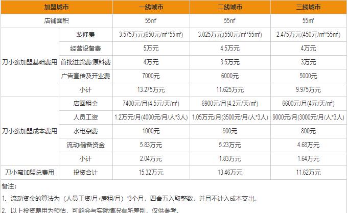 一般来说,加盟的费用受地区影响较大。据估计,刀小蛮的加盟费用分别是一线万元,二线万元,三线万元。至于最佳的加盟级别,就要根据个人的实际情况来分析了。