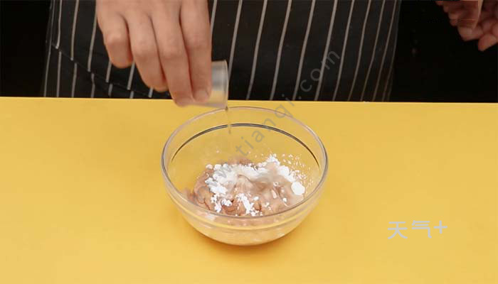 2、鸡脯肉片加入适量盐、淀粉、料酒,拌匀腌制10分钟;