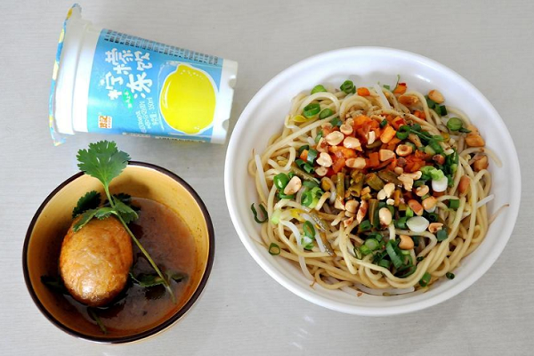 九头鸟热干面采用的是非油炸式的方便面进行加工制作的,在开水中煮制的时间不宜过长, 8分熟即可,然后在凉水中过一下再捞出,然后加入芝麻酱、葱花、酸豆角、榨菜等,吃起来味道鲜香、口感醇厚。九头鸟热干面的产品口味有招牌热干面、酸菜热干面、清香热干面、榨菜热干面、香辣热干面等,可以满足不同购买能力人员的需求,其产品所需要的原料都是直接从市场采购的,经过和面、揉搓、醒面、擀面、刀切等加工流程制作的,手工制作的面条比价劲道、富有一定的弹性,嚼劲十足。