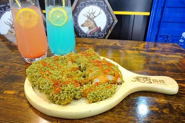 走秀鸡排其门店的主要特色是五彩鸡排,就是说鸡排具有五种颜色,不同的颜色代表不同的口味,分别为番茄味鸡排、黑胡椒鸡排、黄金鸡排、芝士鸡排、咖喱鸡排,五彩的颜色可以吸引众多消费者的眼球,增加消费者的购买欲望。走秀鸡排加工流程也比较简单,需要加入秘制的腌料提前腌制数小时,然后需要包裹鸡蛋液和金鳞脆炸粉,然后在恒温的油锅中进行炸制,其油锅的温度大概在120-180度左右,需要炸制的时间比较短,出餐比较快,顾客不需要等待较长的时间,其秘制的酱料是由十多种香料和中药材按照一定的比例制作而成的,同行都是无法进行模仿的。