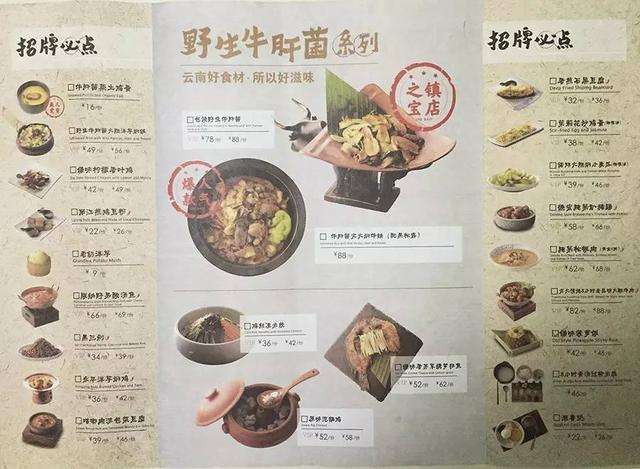 云海肴的招牌特色是各种野生菌菇类菜品,价格在50-80元不等,野生牛肝菌是云海肴的镇店之宝。其他菜式的价格在20-50元之间,人均消费大概在80元左右。
