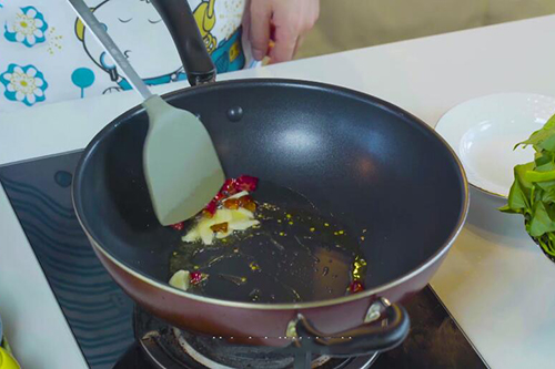 4、放入蒜片、干辣椒段炒香后,放入空心菜快速翻炒;