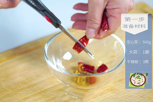食材:空心菜500克,大蒜1瓣,干辣椒3颗;