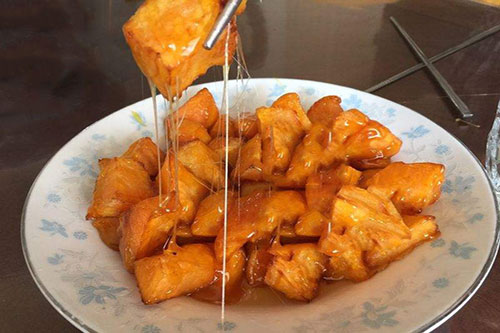 4.将白糖慢慢熬至浅棕红色,泡沫由大变小,迅速下入炸好的地瓜块,快速翻炒均匀;