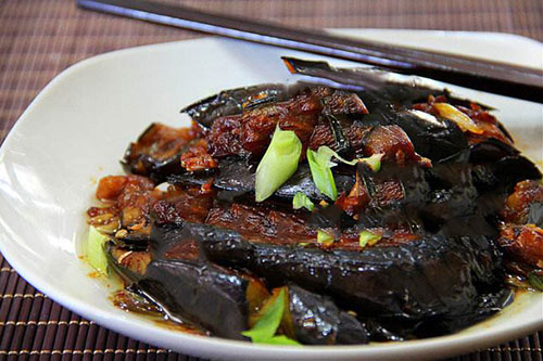 2.锅内倒植物油,干辣椒和八角放入油锅炒出香味,倒入茄子一起翻炒