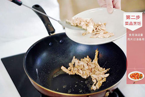 3.锅中放入适量油,油温烧至7成热,放入肉片翻炒至变色后盛出待用;