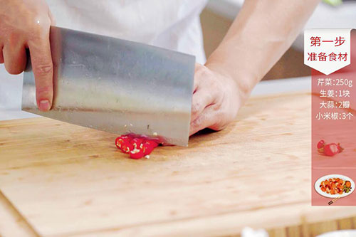 1.芹菜洗净切段,姜1块切末,大蒜2瓣切末,小米椒切圈;