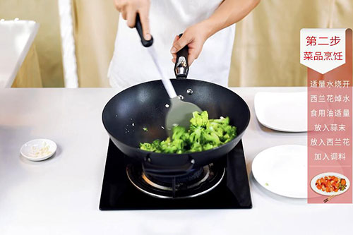 4.放入西兰花翻炒均匀,放入盐半勺、鸡精半勺拌匀即可。