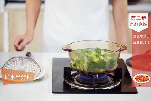 2.锅中放入适量水烧开,放入西兰花焯水半分钟后捞出待用;