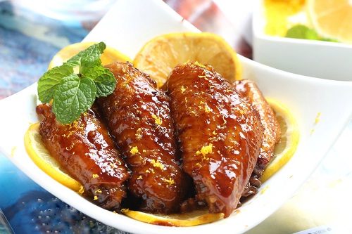7、小火炖至汁快收干时改大火收汁,再挤几滴柠檬汁再鸡翅上即可食用。