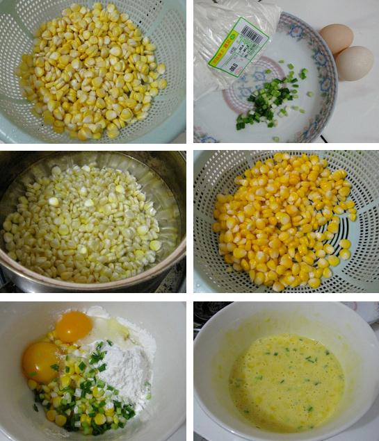 5.将玉米粒、鸡蛋、面粉2-3勺、葱花一起放入一个大碗里。