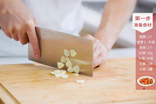 猪腰洗净,横向斜刀切片,竖向切片,胡萝卜切片,青椒切块,大葱切段,姜切片;锅中清水烧开,放腰花烫至变色捞出;油锅烧至7成热,放姜蒜片炒香,放青红椒和胡萝卜片炒至断生,放腰花继续翻炒;最后调入料酒、盐、老抽等炒匀,放葱段和鸡精拌匀即可。