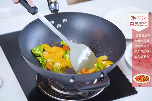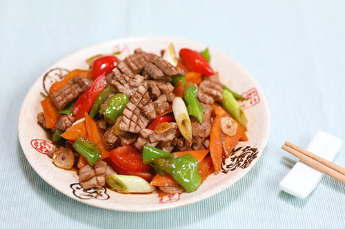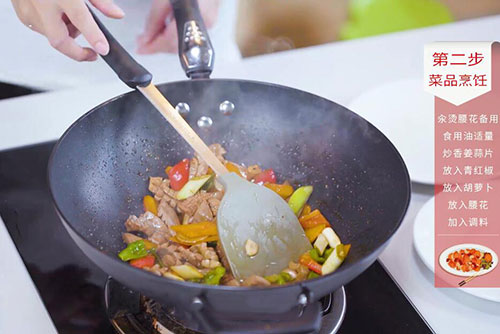 4.锅中放入适量油,油温烧至7成热,放入姜蒜片炒香,放入青红椒、胡萝卜片翻炒至断生,放入腰花继续翻炒;