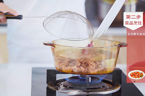 3.锅中放入适量清水烧开,放入腰花汆烫至变色,捞出待用;