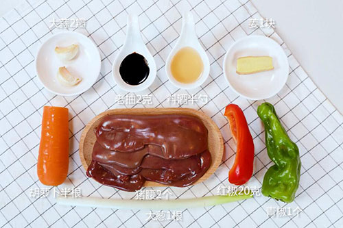 青椒1个,红椒20克,大葱半根,姜1块,蒜2瓣,鸡精半勺,料酒半勺,盐半勺,老抽2克,白糖1勺;