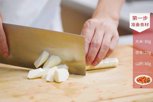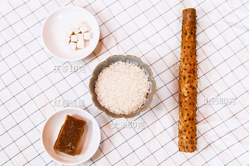 大米80克,茯苓10克,山药80克,红枣5颗,红糖;
