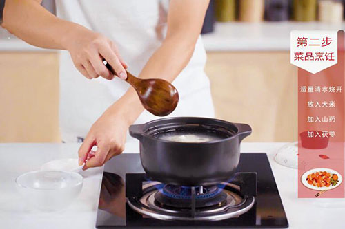 4.锅中放入适量清水,大火烧开,放入大米、茯苓、山药、红枣煮开后,转小火熬煮30分钟,期间不定时搅拌,防止糊锅;