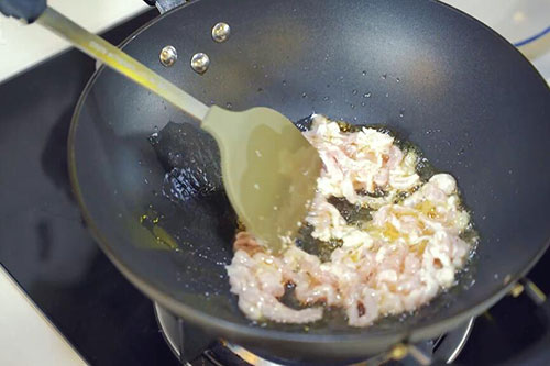 3.锅中放入适量油,油温烧至7成热,放入肉丝快速滑散,变色后盛出待用;