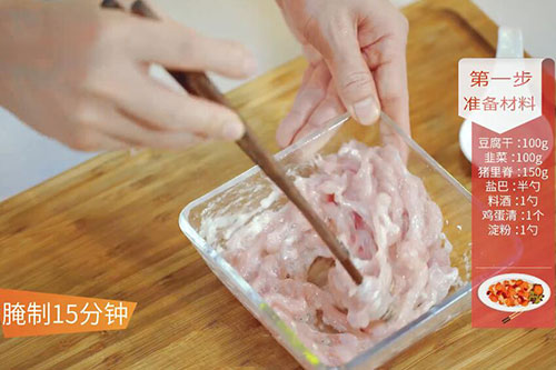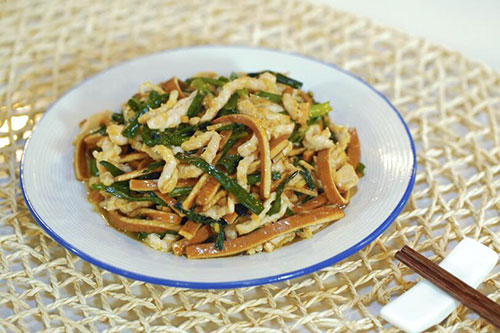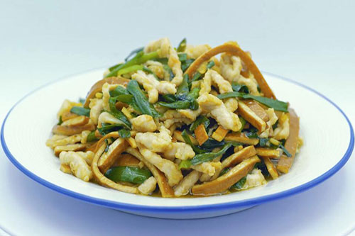 韭菜香干肉丝的做法 在家怎么做韭菜香干肉丝豆腐干洗净切丝,韭菜洗净切段,里脊肉切丝,加盐、料酒、鸡蛋清和淀粉拌匀腌制15分钟,油锅烧至7成热,放肉丝快速滑散至变色盛出,留底油,放姜蒜末炒香,放豆腐干翻炒半分钟后,加入韭菜段炒至诞生,加肉丝炒匀,放生抽、盐、鸡精炒匀即可。