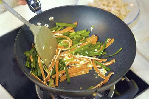 4.锅中留底油,放入姜蒜末炒香。放入豆腐干翻炒半分钟后加入韭菜段翻炒至断生,加入肉丝炒匀,加入生抽半勺、盐半勺、鸡精半勺翻炒均匀即可。