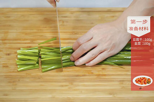 1.豆腐干洗净切丝,韭菜洗净切段;