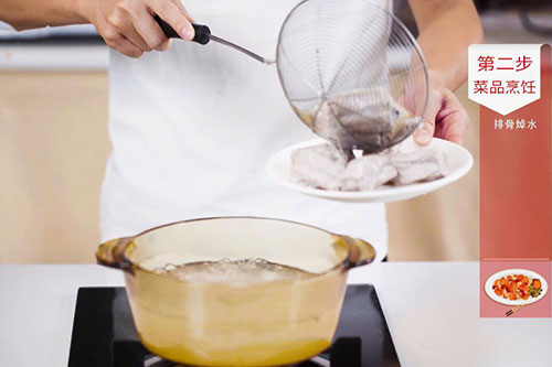 3.锅中放入排骨、姜片、料酒1勺。倒入适量清水煮开,撇去浮沫,煮至排骨断生后捞出;