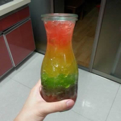 时间不知不觉过了两个半小时,取出,已经成为啫喱状了。那么按照不同颜色一勺一勺舀入玻璃杯中,七彩颜色,真的很好看,一开始,你可以用勺子挖,因为你吃的是水果啫喱,天气太热了,后来嘛,你就当冰水喝了彩虹果冻的做法步骤,将各种口味的QQ糖每种颜色各取12颗逐次分别放进容器内。(容器是可放进微波炉加热的碗或小盘等器皿就行)每次往容器加入50-70克凉开水(水位大概高出QQ糖一点就行),放进微波炉高火叮热三十秒左右至QQ糖融化,搅拌均匀。