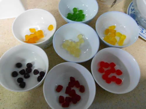 1、将各种口味的QQ糖每种颜色各取12颗逐次分别放进容器内。(容器是可放进微波炉加热的碗或小盘等器皿就行)