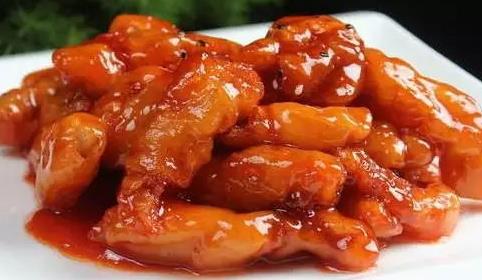 4、锅留底油,烹入糖醋汁,倒入肉片,翻勺,淋香油出勺即可。