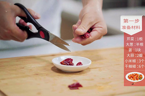 干辣椒6个,花椒3克,小米椒3个,大葱半根,姜1块,蒜2瓣,生抽1勺,料酒半勺,盐半勺,鸡精半勺,胡椒粉1克,白糖1勺;